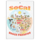 A spectacular cartoon of Southern California – showcasing Los Angeles, Orange County, San Diego. This bright and charming scene has it all – a surfer hangs ten while a couple play in the water, a killer whale leaps up, a muscular beach couple both flex to impress, zoo animals wait for tourists, a t-rex roars a challenge, all beneath the bright California sun shining high above it all.