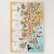 Bright and colourful scene offers a sweet view of Southern California - cute characters enjoy the warm California sun showcasing Los Angeles, San Diego, Anaheim and Palm Springs and also Anza Borrego and Joshua Tree parks plus the border cities of Tijuana, Tecate and Mexicali. This charming scene has it all – a surfer hangs ten while a mermaid lounges on a rock, a killer whale leaps out of the water, a muscular beach couple both flex to impress as a T-Rex roars a challenge and a tank moves into position and much more…