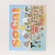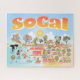 Bright and colourful scene offers a spectacular view of Southern California - wacky characters frolic on the beach and desert of SoCal showcasing Los Angeles, Orange County, San Diego, Santa Barbara, Riverside, Palm Springs, El Centro, Anza Borrego and Joshua Tree parks as well as the border cities of Tijuana, Tecate and Mexicali. This charming scene has it all – a surfer hangs ten while a killer whale leaps out of the water, zoo animals greet the tourists, a muscular fellow flexes to impress as a T-Rex roars a challenge and a tank moves into position and much more…
