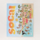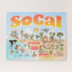 Bright and colourful scene offers a spectacular view of Southern California - wacky characters frolic on the beach and desert of SoCal showcasing Los Angeles, San Diego, Riverside, Palm Springs, Anaheim, Anza Borrego and Joshua Tree parks as well as the border cities of Tijuana, Tecate and Mexicali. This charming scene has it all – a surfer hangs ten while a mermaid lounges on a rock, a killer whale leaps out of the water, zoo animals greet the tourists, a muscular beach couple both flex to impress as a T-Rex roars a challenge and a tank moves into position and much more…