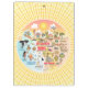 A spectacular cartoon of Southern California – showcasing Los Angeles, Orange County, San Diego. This bright and charming scene has it all – a surfer hangs ten while a couple play in the water, a killer whale leaps up, a muscular beach couple both flex to impress, zoo animals wait for tourists, a t-rex roars a challenge, all beneath the bright California sun shining high above it all.
