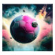 A photo realistic soccer ball as a planet in space with pink smoke and explosions, with 3 moons in the background, digital art.