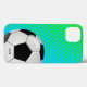 Custom soccer fan iPhone case, with graphics of a blue and green dot pattern background. Graphics of a soccer ball decorates the bottom right corner of the case and custom black text, on the bottom, is ready to personalize. Great phone case for the sports fan or soccer player.