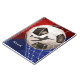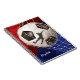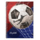 This girls' soccer spiral notebook features an abstract image of a soccer ball just kicked into the goal "tickling the twine" at the back of the goal and semitransparent silhouette of female soccer player kicking a soccer ball, blended with a grungy digital texture and colorblocked red and blue - customize with her name - by katz_d_zynes