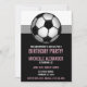 Great for kids! Trendy & modern birthday invitations with a big soccer ball at the top, and the party details in pink and white over black.