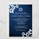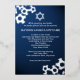 Multi soccer balls sports themed bar mitzvah invitation in blue with bold clean editable white printed text and silver foil Star of David. Silver foil soccer balls in upper and lower corners of this elegant soccer sports mitzvah invitation.