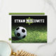 This personalized soccer theme Bar Mitzvah thank you card (flat notecard) design features a nighttime soccer stadium with a green grassy soccer field with a black and white soccer ball sitting on the grass in the lower left corner. There is a pale green Star of David beneath the Bar Mitzvah's name in white in a sports style accent font. This affordable Bar Mitzvah flat thank you card coordinates with the Night stadium Bar Mitzvah invitation and has a white background with a thin black border inside a green upper and lower border. It would be a fitting wrap-up of a soccer or world cup themed Bar Mitzvah.