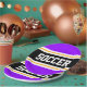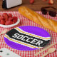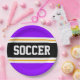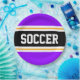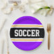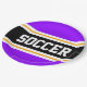 This sporty, athletic design features bold SOCCER text inside a highlighted wide centre black stripe with white and yellow pinstripes against bright purple outer stripes. The text can be personalized.