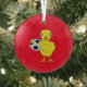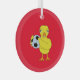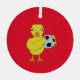 A yellow chick holding a soccer ball is a humourous sport design for back to school, birthdays and holidays.