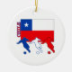 Three soccer players play in front of the Chilean flag. Country name Chile is on the side