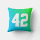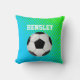 Sporty accent throw pillow with graphics of a blue and green gradient background, with a digital graphic of a soccer ball, on the front. White text, on the front has the name and large player's number, are on the back. Personalize the text for yourself or your favourite soccer / fussball fan or player.