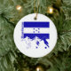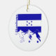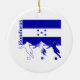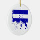 Three soccer players play in front of the Honduran flag. Country name Honduras is on the side