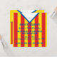 This jersey's is in red and yellow vertical stripes with blue trim and collar.
