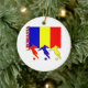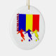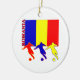 Three soccer players play in front of the Romanian flag. Country name Romania is on the side