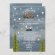 A baby shower by mail invitation featuring an illustration of a baby bear lounging on a tree branch surrounded by stars with original poem. Bear is wearing a flower crown. Mountain illustration and trees at bottom. Personalize the text. Background is dark blue watercolor inspired.