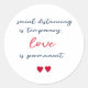 Hand lettered modern typography round sticker with an uplifting coronavirus social self isolation quote stating: "social distancing is temporary, love is permanent" and featuring two red hearts.