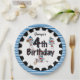 Sock Monkey Baseball 4th Birthday paper plates, a cute design that's great for kids who love sports, especially baseball, and cute monkeys! Features three sock monkey baseball players in baseball caps, one sliding into home plate, one up at bat, one getting ready to pitch the ball! Black polka dotted text reads 4th Birthday and there's a border of blue and white stripes and a black decorative ring. You can easily customize these sock monkey baseball 4th birthday paper plates with a name!