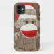 a classic sock monkey in white, brown and red is featured on this iphone case