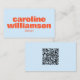 This business card features your name in big, bold orange letters on a soft blue front with your industry below. The back is a clean soft blue with just a QR code — scan it and it goes straight to your website, portfolio, or wherever you want to send people. It's a great option if your work lives online and you'd rather point someone to a link than list out every contact detail on the card. Simple, modern, and easy to update if your information changes.