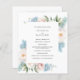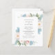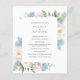 A frame of Rustic white blue and pink peony roses and Flowers with soft sage green leaves border your wedding details in a classic grey font. On the reverse side a template to insert the list the members of your wedding party (officiant, parents of bride and groom, maid of honour, best man, bridesmaids, groomsmen, flower girl and ring bearer)