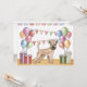 Destei's original cartoon illustration of a cute Soft-coated Wheaten Terrier breed dog. The dog is placed in a colourful birthday setting with pastel colour birthday balloons, gifts and a bunting banner. The pastel colours include pink, green, blue, red, orange and purple. The dog is standing on a yellow wood floor texture and the background has a playful pastel colour polka dot pattern. Personalize the sample text areas with the details of your event.