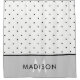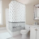 This stylish and chic shower curtain features black and white polka dots, with a bottom border in soft grey. Personalize with your name and initial.
