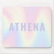 Trendy, personalized mouse pad featuring a soft pastel rainbow pattern background and your name in light purple.