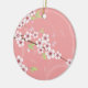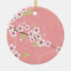 Pretty and girly soft pink cherry blossom design features a branch from the pink flowering cherry or dogwood tree sakura. Baby pink background with light swirls, with a foreground of dark brown tree branches with petals and green leaves. A lovely design for baby shower, feminine events or occasions.