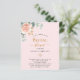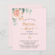A girly pink background. Decorated with a rose gold and blush pink floral, rose flower and green watercolored eucalyptus leaves, sprigs, greenery and a faux gold sprig. Personalize and add the name of the bride to be and party details.