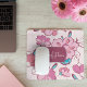 Add a touch of feminine charm to your workspace with this beautiful mousepad featuring a vibrant pink floral design and a stylish script font for personalization. The delicate flowers in shades of pink and teal are set against a soft pink background, creating a visually appealing and cheerful aesthetic. It's perfect for anyone who loves floral patterns and wants to add a personalized, yet sophisticated, touch to their desk setup. This design offers a lovely way to express your personal style and bring a bit of nature indoors.
