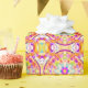 Wrapping paper in a tie dye pattern in soft, spring flower inspired, shades of pink, green, peach and violet