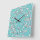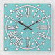 A soft shade of teal blue, with roman numerals and white spots, make this wall clock special and gorgeous! Hang it in the library, den, beach house, or office. This clock would make a unique housewarming or boatwarming (or houseboat warming) gift. Available in two sizes of round clock, or a square clock. Copyright Scarebaby Design.