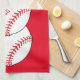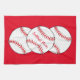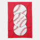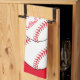 This kitchen towel features red and white softballs surrounded by a red background. The text reads: Softball Mom. Easily customize the text for a special sports fan or remove entirely. Great for Mother's Day or any time of year.