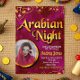 Entrez dans un monde de mystère et soyez enchanté par cette invitation à une soirée arabe. Cette invitation a été rendue spéciale en utilisant une couleur de fond captivante avec des décorations dorées et diamantées complémentaires pour capturer la vibrance et l'attrait d'une fête sur le thème arabe.