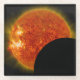 The dark shadow of the moon crosses in front of the sun during a solar eclipse captured in space and enhanced in this image.