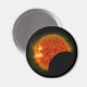 The dark shadow of the moon crosses in front of the sun during a solar eclipse captured in space and enhanced in this image.