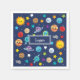 Celebrate the solar system with this cheerful outer space themed birthday party paper napkin. Napkin has a happy sun, happy planets (Mercury, Venus, Earth, Mars, Jupiter, Saturn, Uranus, and Neptune), as well as happy dwarf planet Pluto, asteroids, and stars. Personalize the napkin with your young space lover's first name.