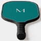 Pickleball paddle with blue-green , teal solid colour background and light grey font .Simple and trendy design by Alma Wad .Personalize it with your name and monogram now ..