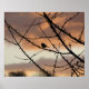 A single bird perched on a bare branch against a dramatic sunset sky.