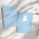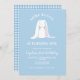 Some bunny is turning one birthday party invitation in blue with gingham back.