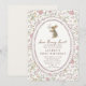 Floral bunny first birthday invitation featuring a sweet watercolor rabbit holding a flower, framed inside a scalloped oval border. The soft cream background and delicate floral pattern in blush, sage green, and muted pastels create a charming cottagecore and storybook-inspired look.