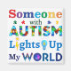Inspirational quote of “Someone with AUTISM Lights Up My WORLD” with colourful Autism puzzles, a symbolic light bulb and lighting on the message to support autistic children and their families.