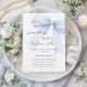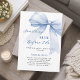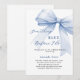 An elegant white background, decorated with blue bow. Personalize and add a name and party details.