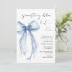 Chic bridal shower invitation featuring a delicate light blue coquette bow watercolor, "something blu before I do" in a modern calligraphy script, and the bride's name name and shower details in simple lettering.