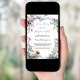 An elegant white background, decorated witth pink and blue wildflowers and a blue ribbon. Personalize and add a name and party details.