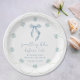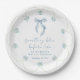 Chic bridal shower paper plates featuring a whimsical hand-painted green dotted scallop and blue floral watercolor border, a delicate blue coquette bow watercolor, "something blue before I do" showcased in an elegant blue calligraphy script, and the name of the bride and shower date in classic serif typography.