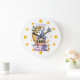 This fun clock design features an a stack of books with a sorcerers hat. In the background there’s a crescent moon and stars. Instead of numbers, this clock has stars. The text reads ”Something Magical Happens When You read A Book”. A perfect addition for any child's room.