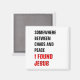 Stylish, minimalist Christian magnet with inspirational text reading SOMEWHERE BETWEEN CHAOS AND PEACE I FOUND JESUS in bold black and red typography, Matching gifts available.