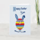 A cute Easter bunny for your son in the shape of an Easter egg. The egg is decorated with stripes, zigzags and spots in yellow, red and blue, and the background is light blue. Inside, the greeting reads "A happy Easter bunny is here to wish a special son a very Happy Easter!" or this can be customised to your requirements.