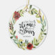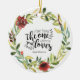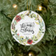 Inspirational quote scripture personalized Christmas ornament depicts a simple floral watercolor wreath with red flowers and greenery. It features Bible Verse Song of Solomon 3:4, " I have found the one whom my soul loves." Customize the back with names and date or the details of your choice.
